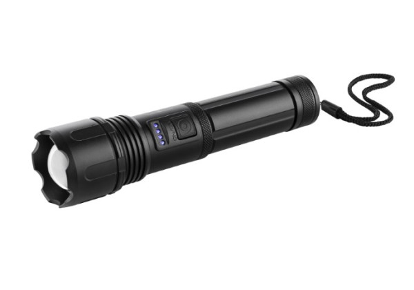 wiederaufladbar (1200 mAh Akku), fokussierbar mit Powerschalter (100%/70%/50%/Blinken/SOS), robustes Profi Aluminiumgehäuse, Micro-USB Buchse, Wechselsystem für konventionelle AAA-Batterien (exkl.). 1200 mAh Akku oder 3xAAA Batterie optional, 650 Lumen/15Watt, 5 Leuchtmodi (100%, 70%, 50%, Strobo- und SOS Blinken), Taster Schaltung (langes Drücken zum Ausschalten) fokusierbar, Ladestandanzeige, Handschlaufe, VPE 20. Ladekabel, Designbox