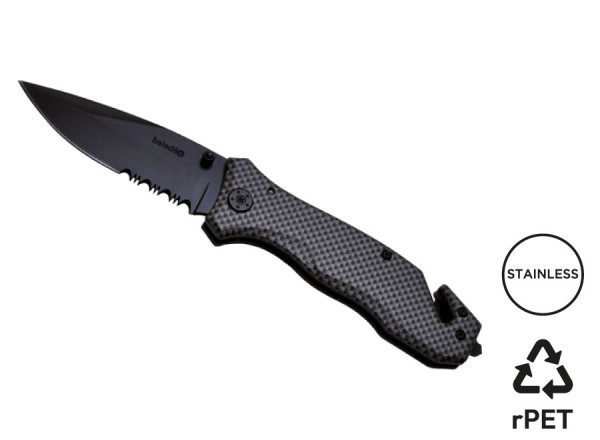 Klappbares Messer mit Klinge aus rostfreiem 420er Edelstahl und Titanbeschichtung, bestehend aus einem feinen Teil der Klinge (für präzise Schnitte) und einem teilweise gezahnten Teil (für schwierigere Schnitte). Montage mit Torx-Schrauben. Griff aus rostfreiem Edelstahl und Aluminium mit Kohlefaser-Imitat-Beschichtung. Halbautomatisches Öffnungssystem für Rechts- und Linkshänder mit einem Liner Lock Sicherheitsmechanismus. Gürtelschneider und Glasbrecher am Ende des Messers. Gürtelclip. Wird in einem grau melierten Etui aus recyceltem RPET geliefert.
