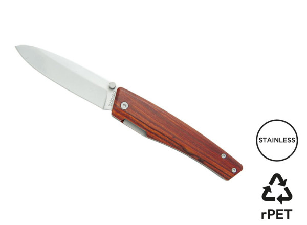 Klappbares Messer mit Klinge aus 420er Edelstahl. Montage mit Torx-Schrauben. Griff aus Padoukholz. Einhändiges Öffnen/ Schließen mit einem Liner Lock Sicherheitsmechanismus. Wird in einem melierten grauen Etui aus RPET geliefert.
