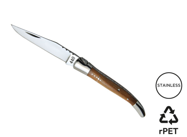 Klappbares Messer, das gemäß sehr strengen Spezifikationen hergestellt wurde: Klinge aus rostfreiem 440er Edelstahl, auch als 'chirurgischer Stahl' bezeichnet. Er bietet eine perfekte Kombination aus Chrom (das vor Rost schützt) und Kohlenstoff (das für Schärfe sorgt). Rasiermesserscharfe Klinge. Griff aus Olivenholz. Zwei geschmiedete Heftbacken aus rostfreiem Edelstahl. Verzierte Feder. Dieses Modell ist zudem mit einem Motiv des Hirtenkreuzes verziert. Wird in einem melierten grauen Etui aus RPET geliefert.