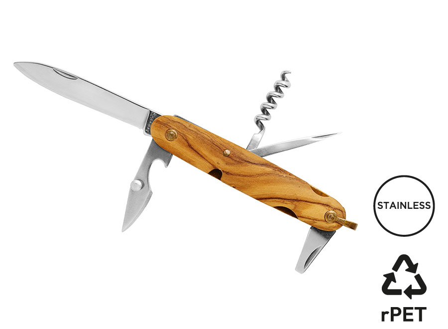 Elemente komplett aus hochbeständigem Edelstahl (2CR13). Griff aus Olivenholz. Vernietete Montage. 6 Funktionen: Messer, kleine Taschenmesserklinge, Flaschenöffner, 4-mm-Flachschraubendreher, Locher, Korkenzieher mit 5 Spiralen. Messingbügel. Wird in einem graumelierten RPET-Etui geliefert.