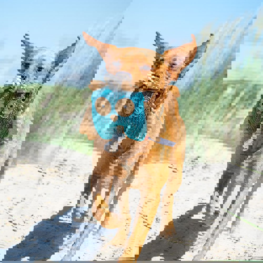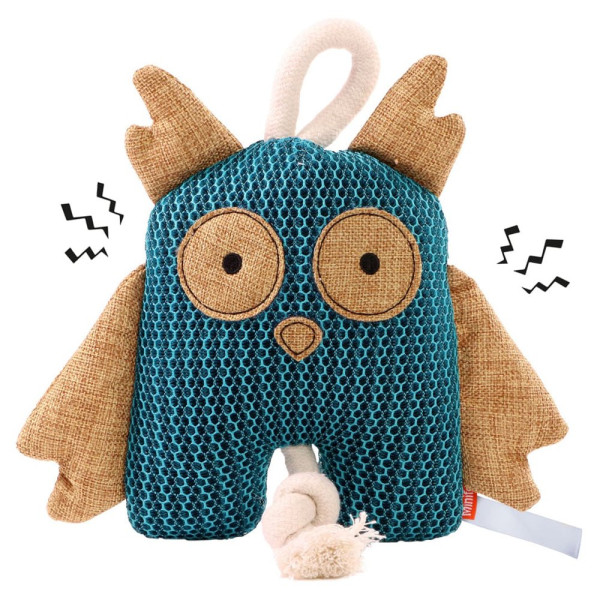 Nicht nur im Wald macht es Hund und Herrchen jede Menge Freude, mit dem Hundespielzeug Eule herumzutoben; die Eule ist das Highlight in jeder Spielkiste. Blau in Kombination mit Details aus Jute, spannenden Knotenelementen und seiner Knisterfunktion, wird der Spieltrieb großer und kleiner Hunde gefordert und gefördert. Die kleine Eule kommt gerne mit auf die Hunderunde durch Wiesen, Wald und Felder.
