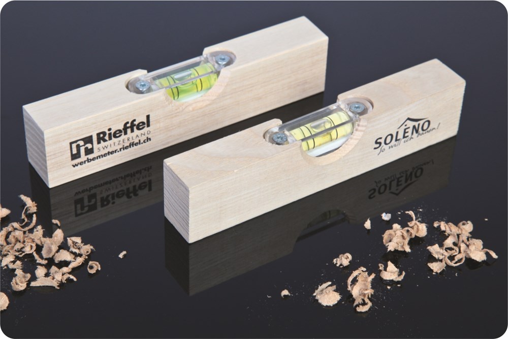Bestseller Wasserwaage aus Eschenholz mit integrierter Horizontallibelle. Preisgünstiges Naturprodukt für den Hausgebrauch und Heimwerker. Werbelogos kommen auf der großen Werbefläche sehr gut zur Gelung. Sympathische Wasserwaage aus nachwachsendem Rohstoff. Made in Germany, Garantie 3 Jahre.