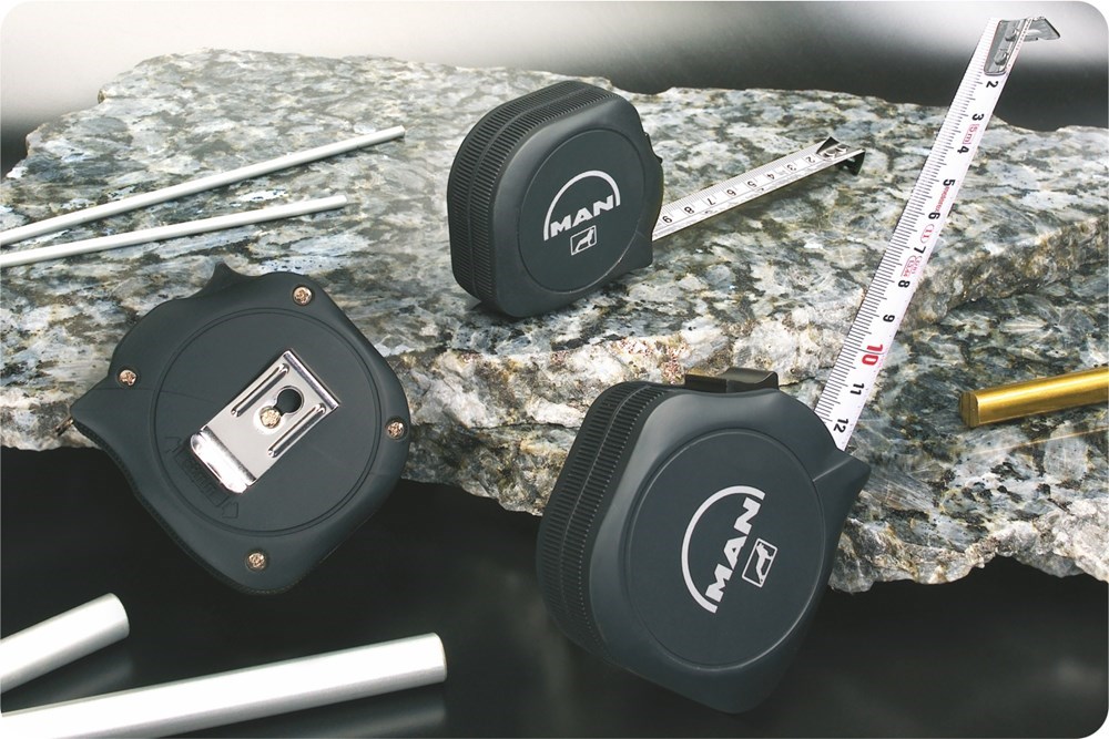 Bestseller Bandmaß von hoher Qualität im schwarz gummierten Gehäuse für optimales Handling. Werbelogos kommen hervorragend zur Geltung.