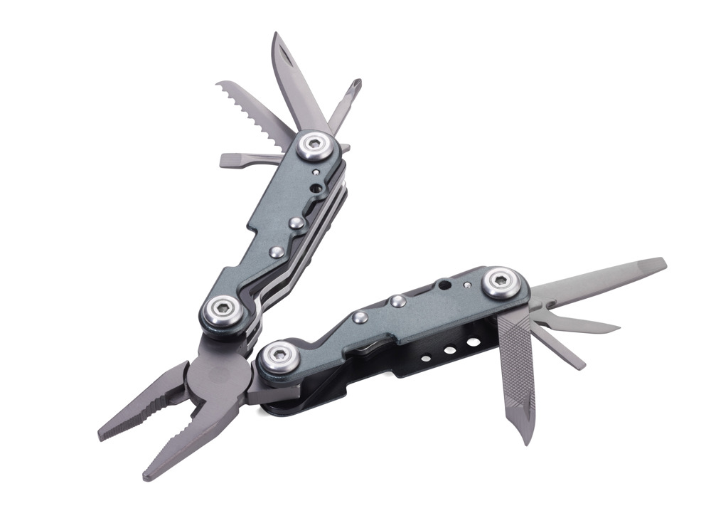Mini-Werkzeug Schlüsselanhänger mit 10 Funktionen, integrierte Feder, Drahtschlaufe für Schlüssel, Zange, Messer, Säge, Flaschenöffner, Schlitzschraubendreher in 3 Größen, Kreuzschraubendreher, Holz- und Metallfeile, Seitenschneider, Vorstecher (Ahle), 420 Edelstahl, Aluminium, eloxiert, matt, grau