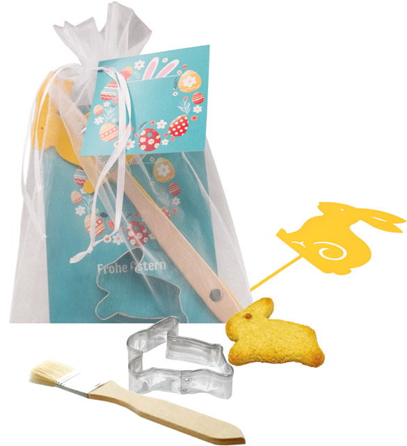 Mit der liebevollen Kombination aus Ausstechform, Backpinsel, Metallstecker und Rezeptkarte versetzen Sie Ihre Kunden im Handumdrehen in fröhliche Osterstimmung. Die Klappkarte bietet eine perfekte Bühne für Ihre Werbebotschaft: Ob mit Ihrem Logo oder einem individuell gestalteten Design – bereits ab 250 Stück machen Sie daraus ein persönliches Highlight.