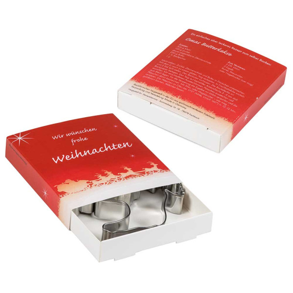 Jetzt noch mehr Platz für die individuelle Werbebotschaft zu Weihnachten bietet die Premium-Box. Die Karton-Box enthält zwei Backförmchen. Auswahl an Backförmchen. Omas Butterkekse Rezept befindet sich optional auf der Rückseite der Box.