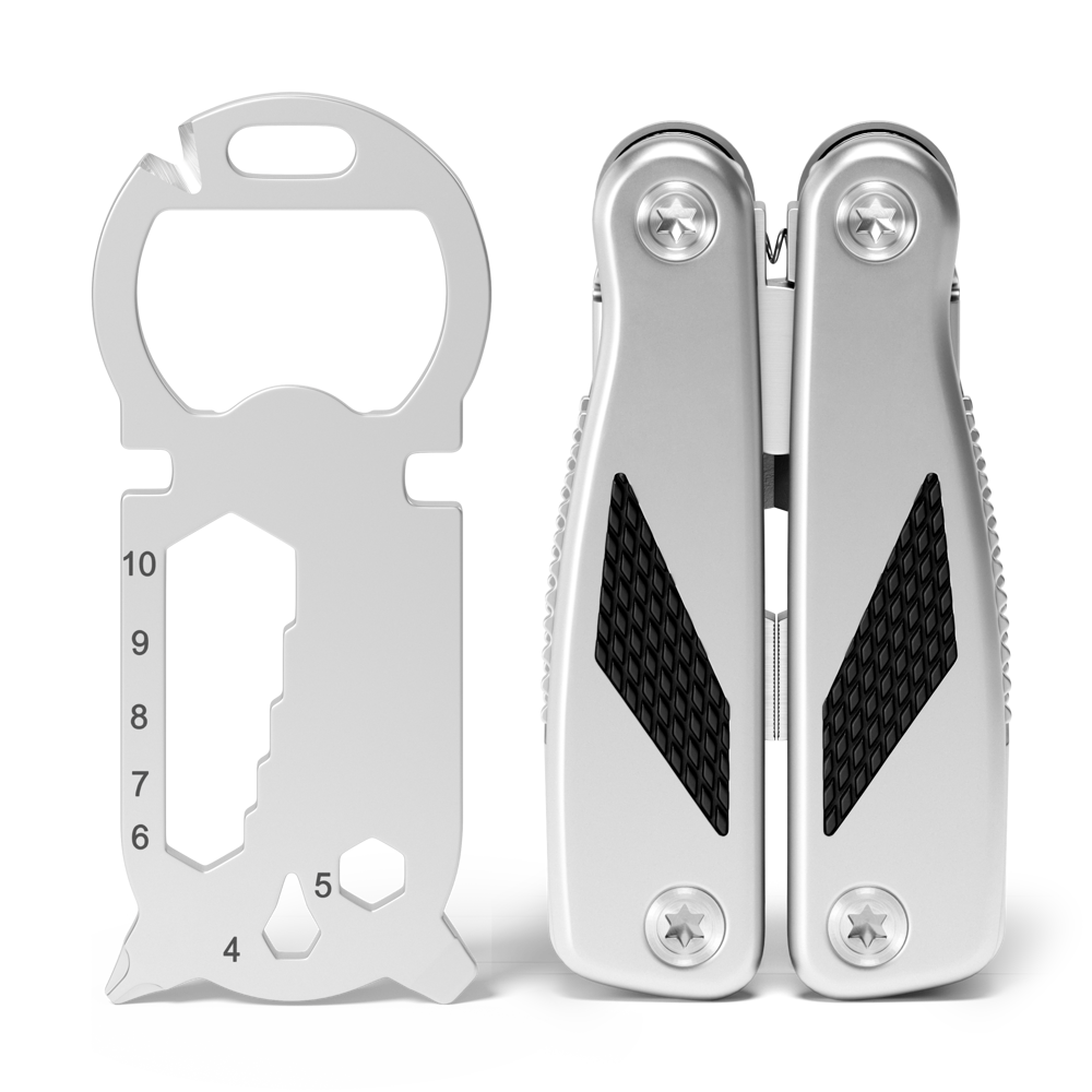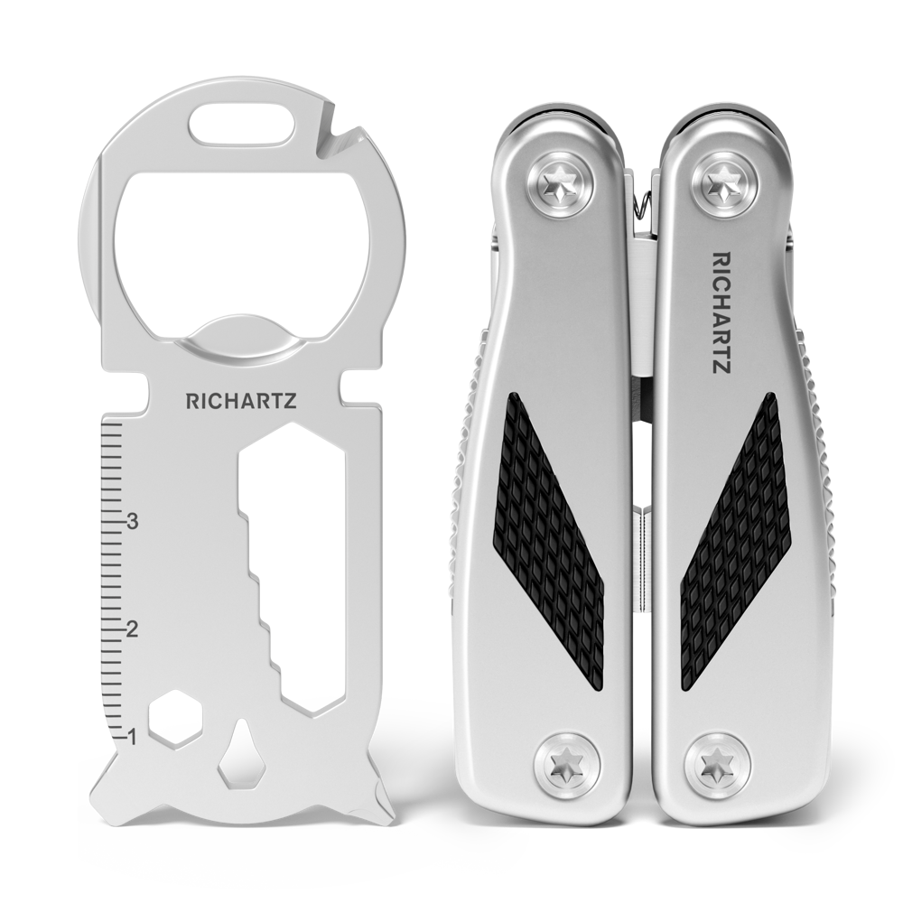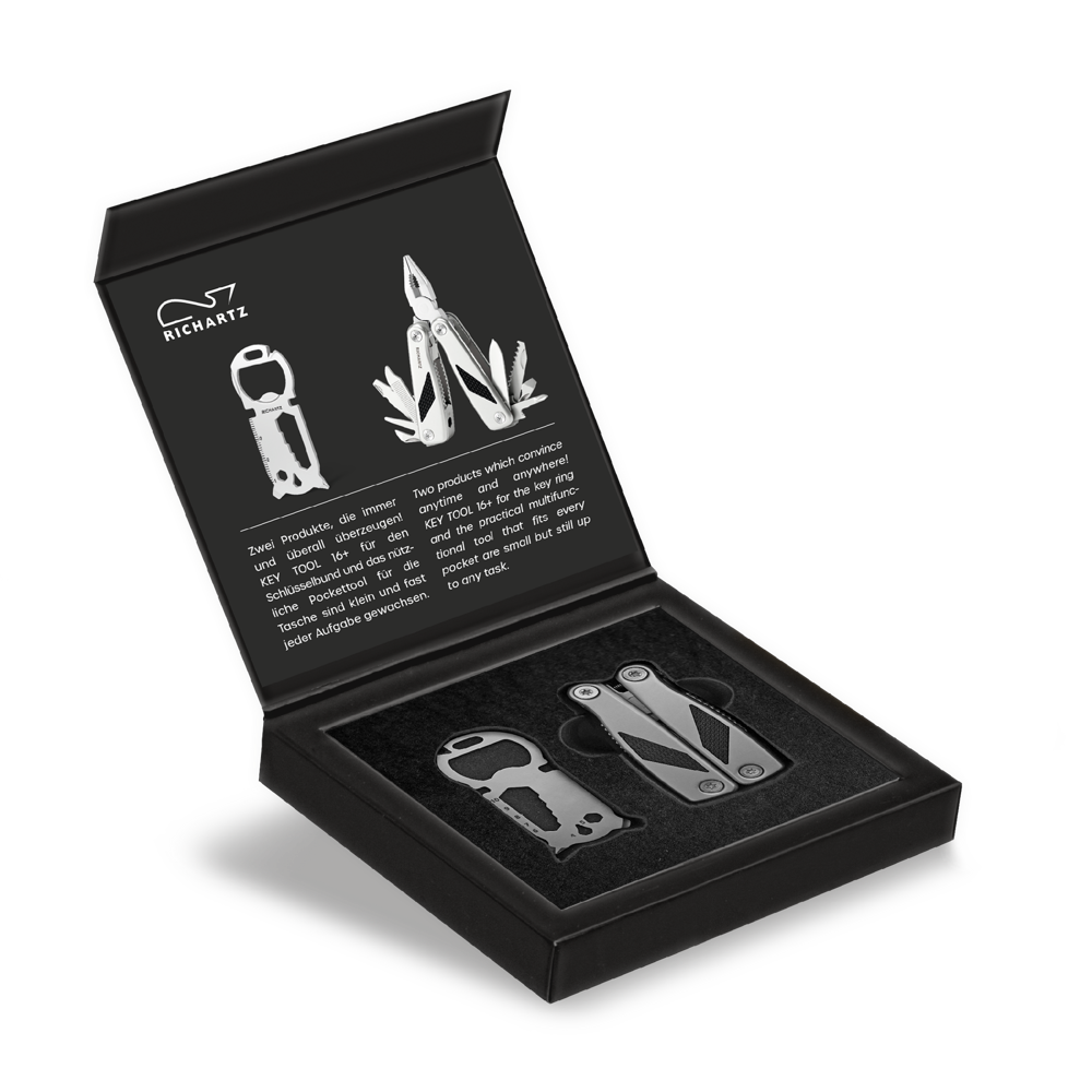 Zwei Produkte, die immer und überall überzeugen. GRIP tool pocket, das nützliche Pocket tool für die Tasche, und KEY tool 16+, das schlüsselgroße Tool mit 16 Funktionen für den Schlüsselbund, sind so klein und doch jeder Aufgabe gewachsen. Die gute Verarbeitung aus matt gestrahltem Edelstahl besticht. Ein Set, der jeden Tag Freude macht.