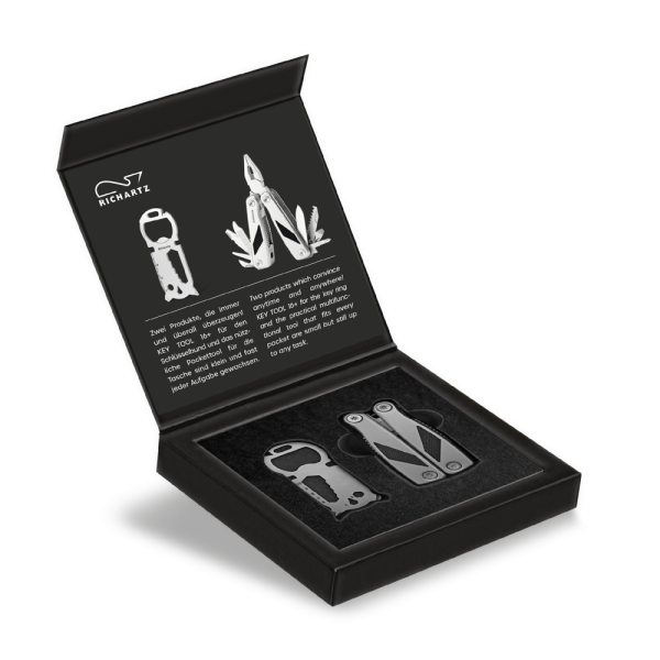 Die vielen nützlichen Funktionen der beiden Problemlöser sind ein Mehrwert im Alltag und durch die lange und häufige Nutzung ist ein dauerhafter Werbeerfolg garantiert. Durch die hochwertige Geschnekverpackung wirkt das Set ansprechend und verstärkt die positive Bindung von Marke zu Kunde.