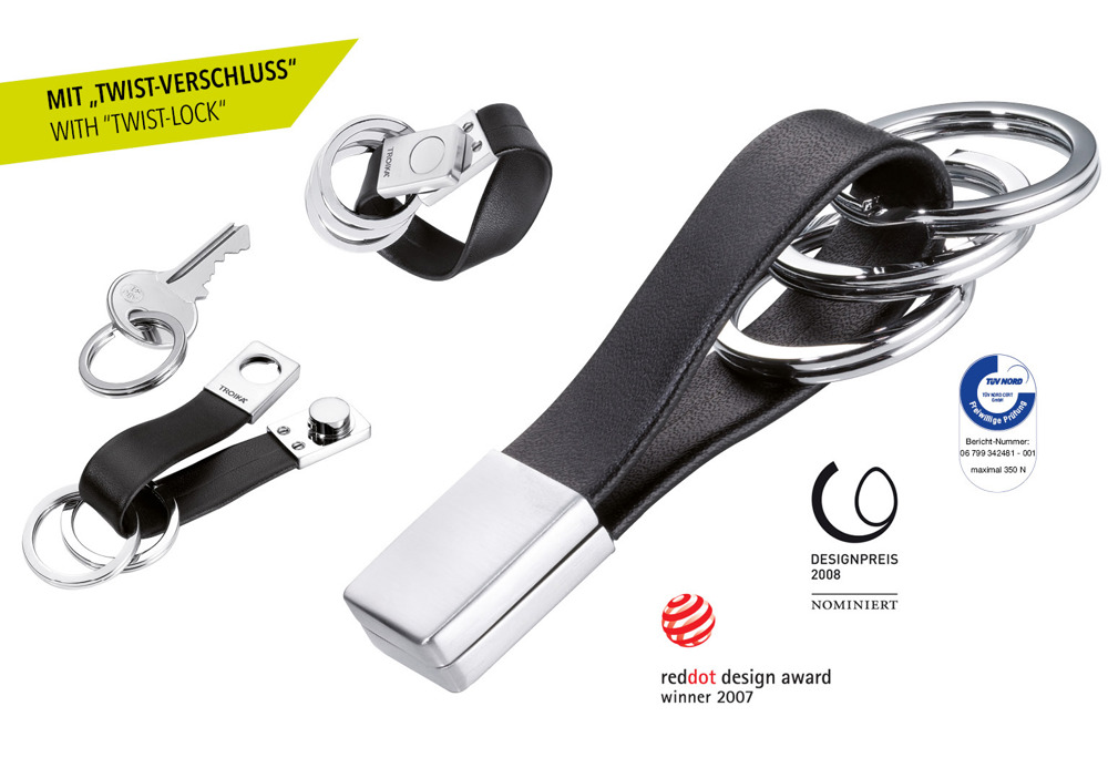Schlüsselanhänger mit eckigem "Twist-Verschluss", Lederschlaufe, 3 Schlüsselringe, Leder/Metall,... mehr