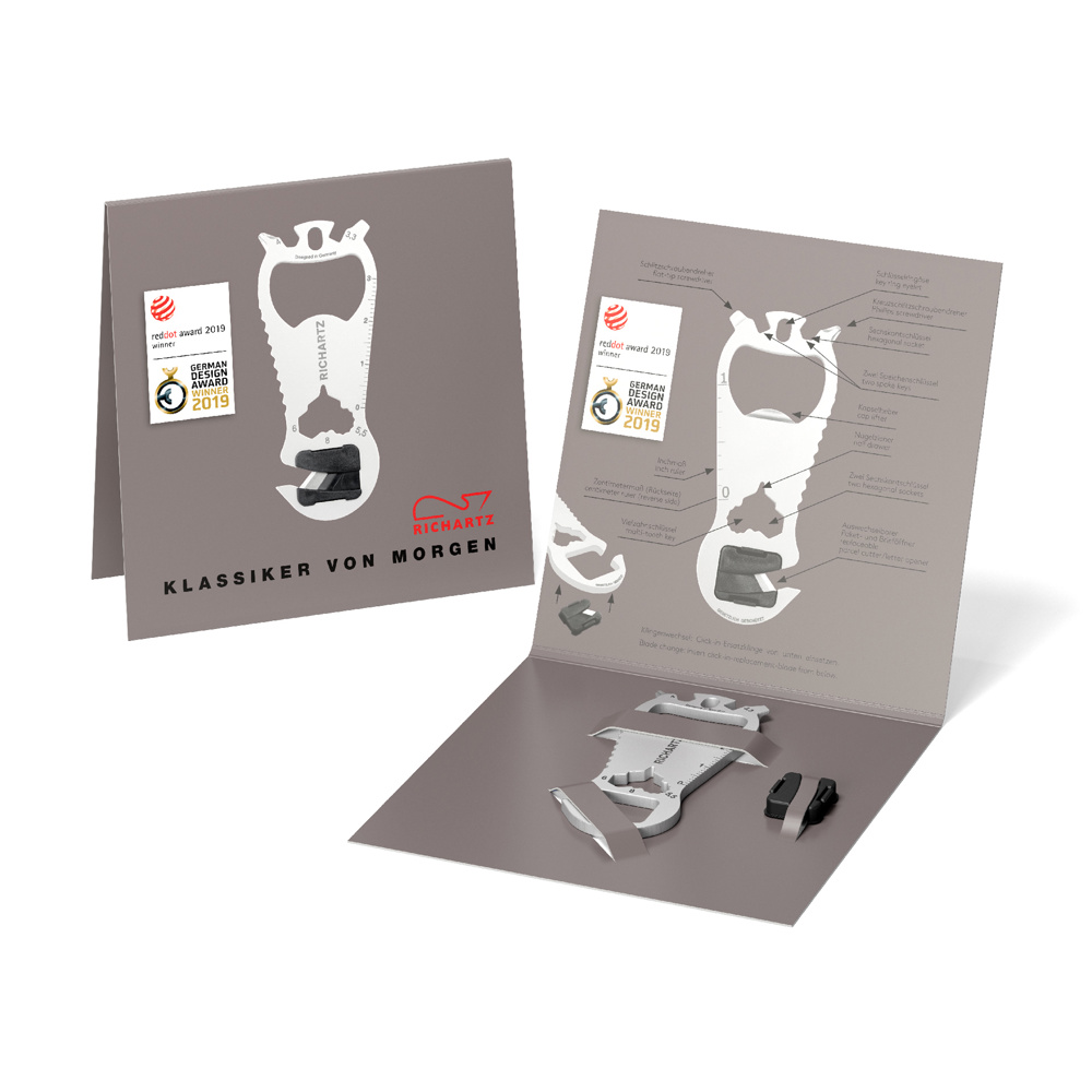 Ausgezeichnet mit dem German Design Award ist das RICHARTZ KEY TOOL® cut der erfolgreiche Werbeträger für Marken und Unternehmen. Mit einer individuellen Lasergravur und individuell gestalteter 4-seitigen Verpackung in 4c, werben Marken aufmerksamkeitsstark und aussagekräftig!
