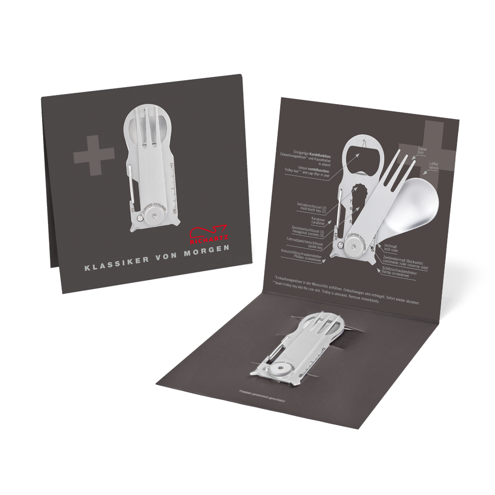 Ausgezeichnet mit dem German Design Award, reddot design award und dem IF Design Award ist das RICHARTZ KEY TOOL® PLUS snack der erfolgreiche Werbeträger für Marken und Unternehmen. Mit einer individuellen Lasergravur und individuell gestalteter 4-seitigen Verpackung in 4c, werben Marken aufmerksamkeitsstark und aussagekräftig!
