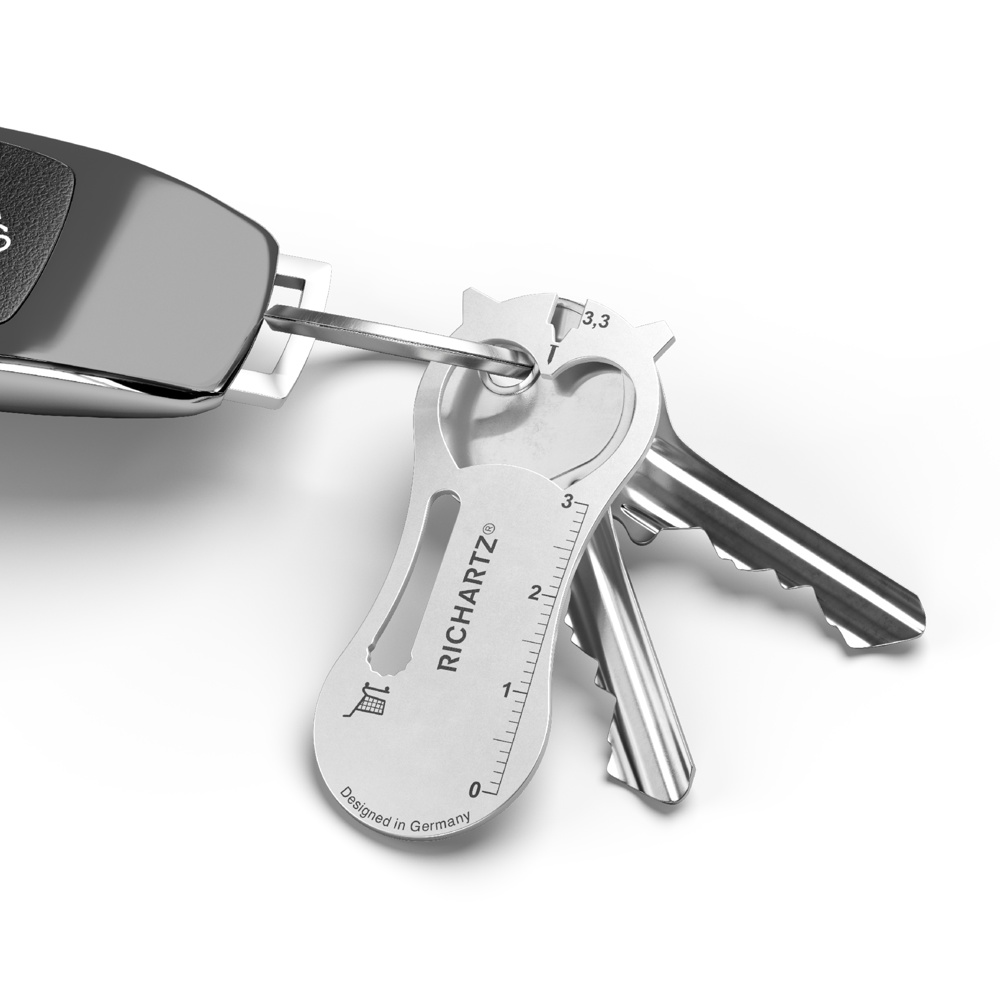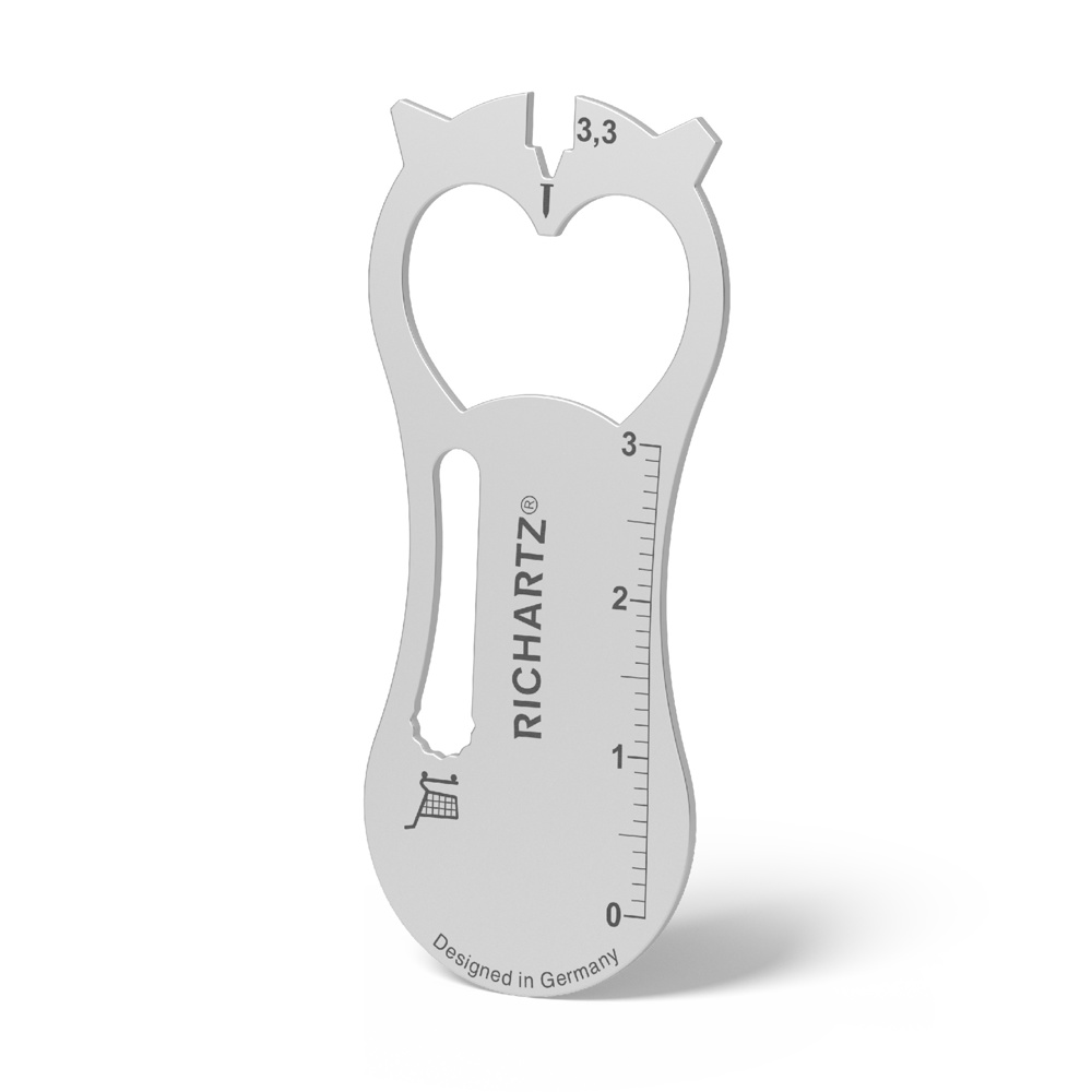 Unser Einkaufswagenlöser mit Herz: Formschöne Ausgabe mit in den Kapselheber integrierter Herzform. Dank Schlüsselring-Slot können alle Funktionen bestens genutzt werden. Damit beweist das gute Stück zudem noch eine Portion Cleverness. Dass das Ganze mit seinen zahlreichen Funktionen im Alltag unschlagbar vielseitige Dienste leistet und dazu etwas fürs Auge ist, muss RICHARTZ nicht extra erwähnen. Oder...?!