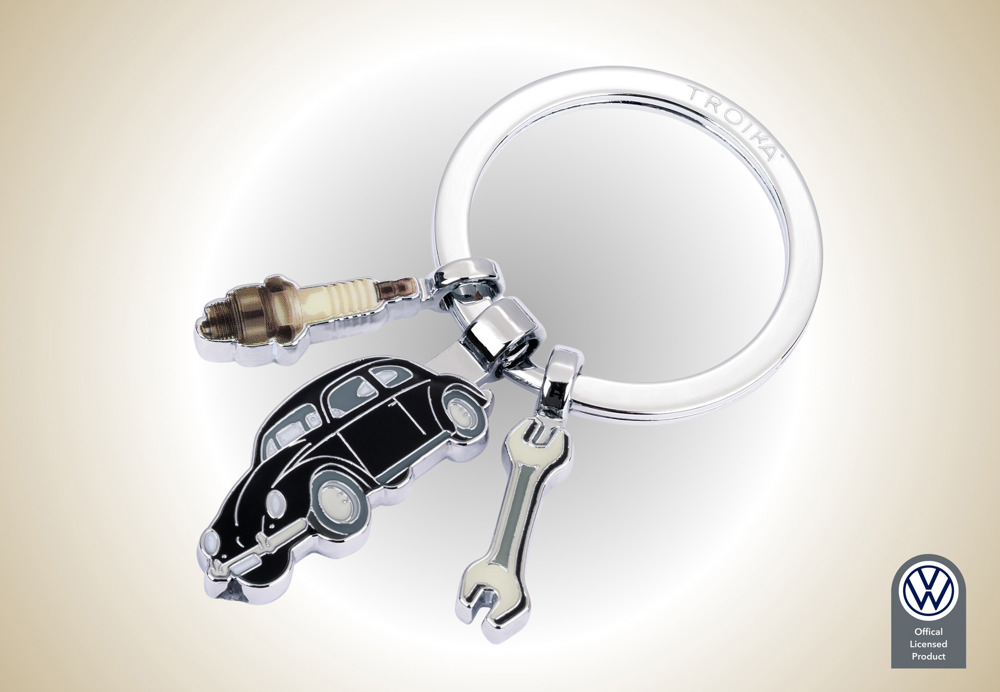 Schlüsselanhänger mit 3 Anhängern, Volkswagen Typ 1, Schraubenschlüssel, Zündkerze, Emaille,... mehr