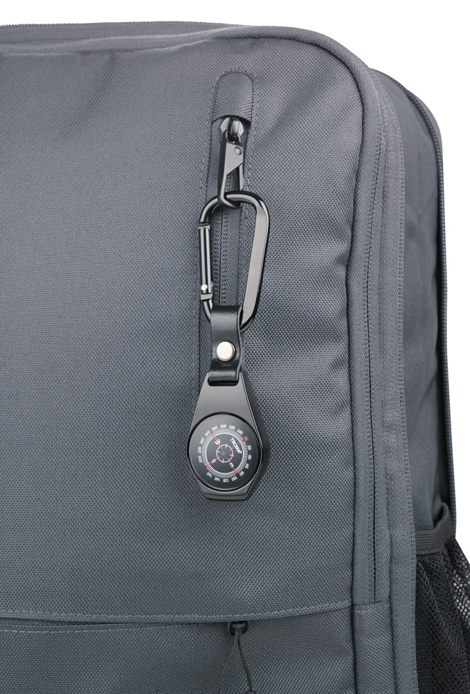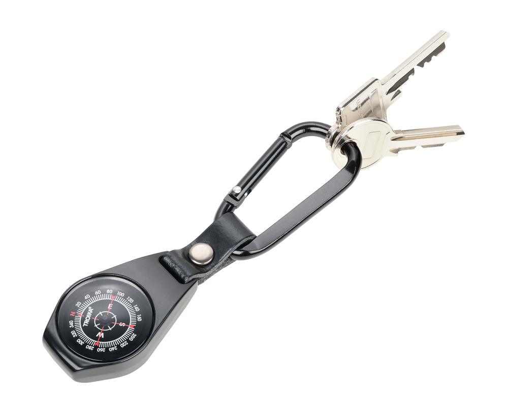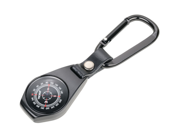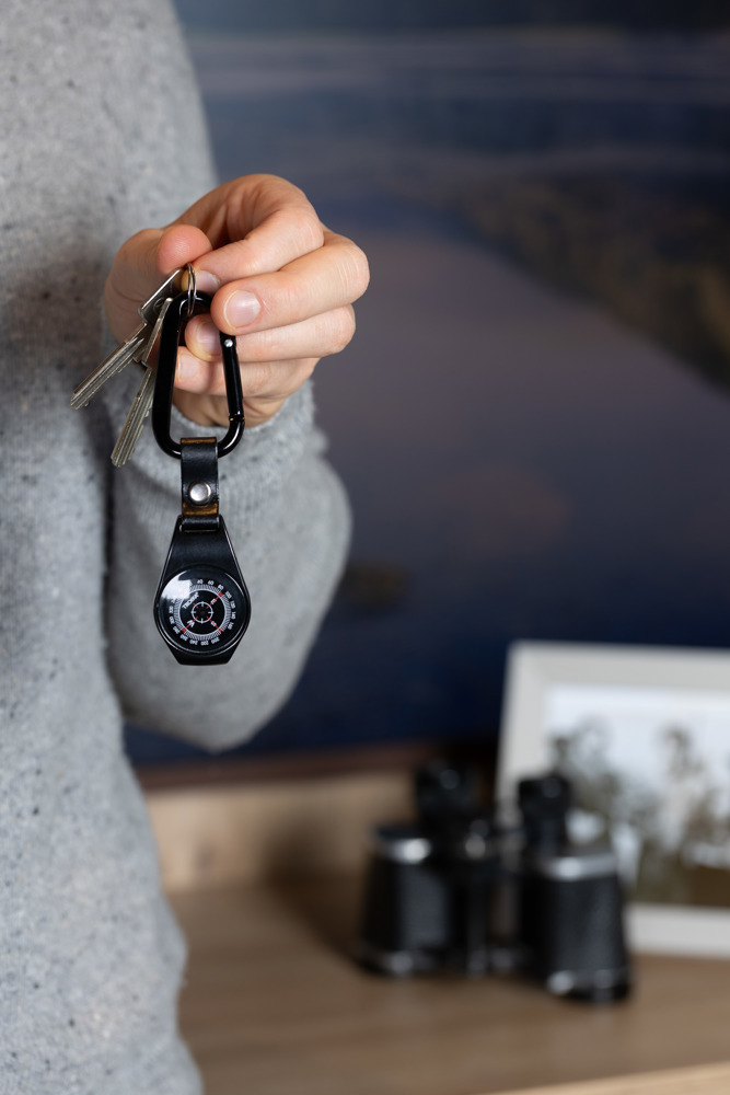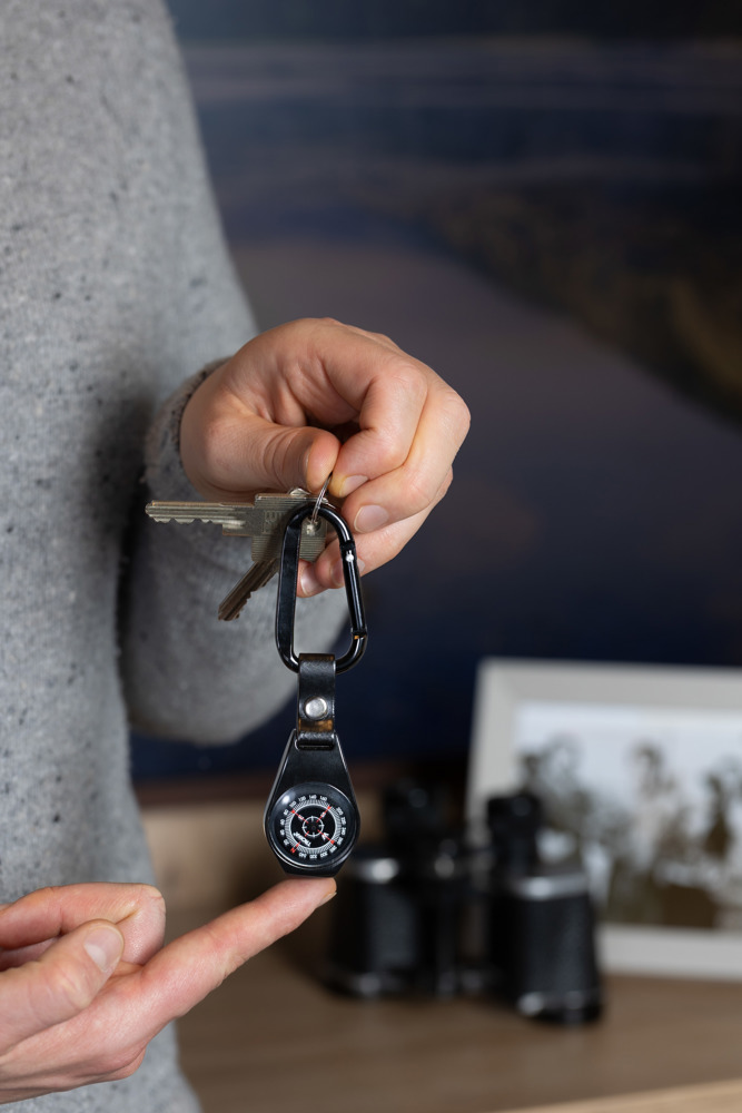 Schlüsselanhänger mit Kompass, inkl. Karabinerhaken und Lederschlaufe, Leder, Metallguss, schwarz