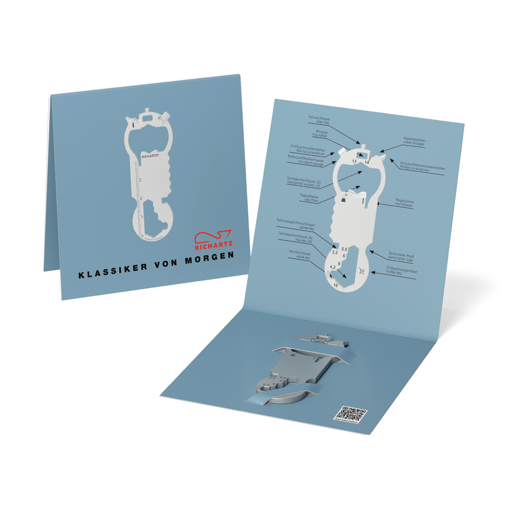 RICHARTZ® KEY TOOL bike ist der erfolgreiche Werbeträger für Marken und Unternehmen. Mit einer individuellen Lasergravur und individuell gestalteter 4-seitigen Verpackung in 4c, werben Marken aufmerksamkeitsstark und aussagekräftig!