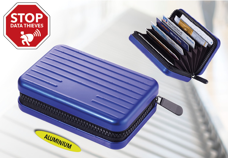 Kreditkartenetui im Stil eines Hartschalenkoffers, Reißverschluss, mit Ausleseschutz (für RFID Chips), 9 Fächer mit Platz für ca. 20 Karten, Geld und Belege, Aluminium, Polyester, matt, blau