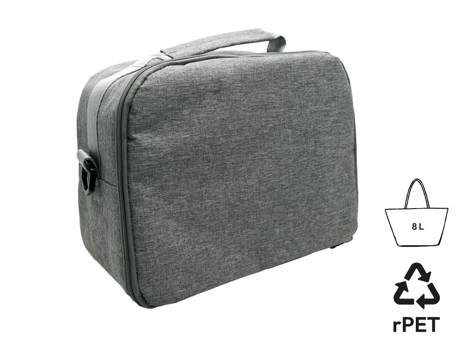 Isotherme Tasche aus meliertem Wulong-Gewebe RPET. Kompatibel mit all unseren Bento-Modellen. Isolierende Schicht mit 3 mm Dicke. Schulterriemen. Möglichkeit, eine Visitenkarte einzufügen. Verstärkter und gepolsterter Griff für besseren Halt. Reißverschluss. Fassungsvermögen: 8L.