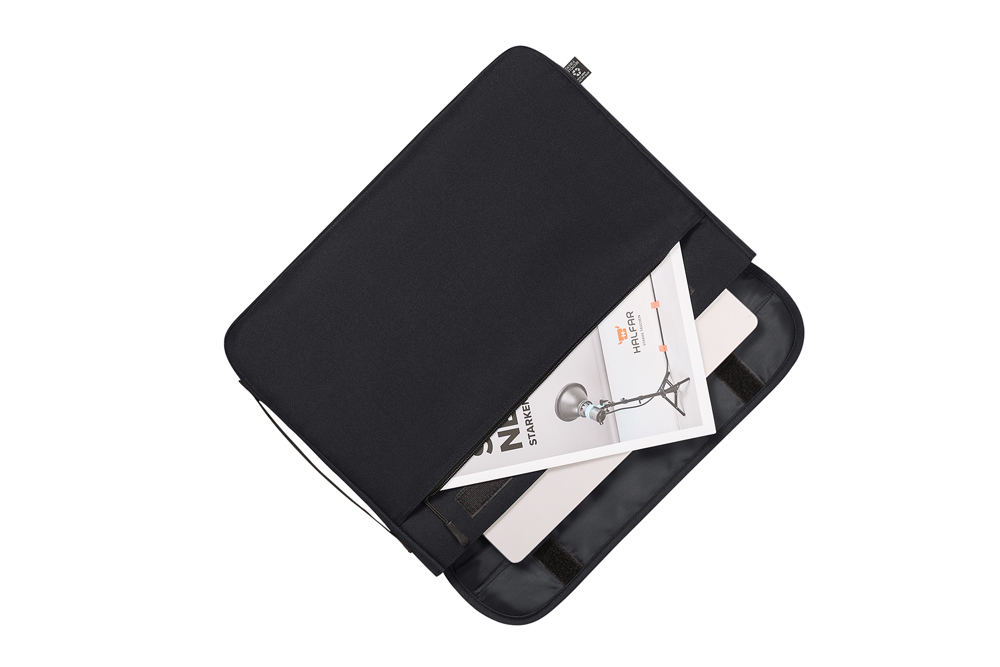 elegante Laptop-Mappe mit recyceltem Oberstoff; gepolstertes Hauptfach; gepolsterter Deckel mit Klettverschluss; große Vortasche mit Reißverschluss; innen AirTag-Fach; rückseitige Schlaufen zur Befestigung individueller Accessoires, z. B. Schultergurt (nicht im Lieferumfang); ergonomischer Handgriff rückseitig, zur Fixierung am Trolley-Gestänge geeignet; flacher seitlicher Handgriff zum einfachen Herausheben, z. B. aus Rucksäcken
