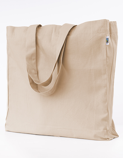 100% Fairtrade-zertifizierte Bio Baumwolle | Robuste Köperbindung | Breite, lange Trageriemen (L/B ca. 70/4,5 cm | Oversize Größe 50 x 50 cm | Breite Boden- und Seitenfalte | Schwere Grammatur von 280g/m² | Kreuznähte an Henkelverbindung | Stabile Innenverkettung | Fairtrade Siegel außen am Beutel sichtbar | Lieferung ohne Inhalt/Deko