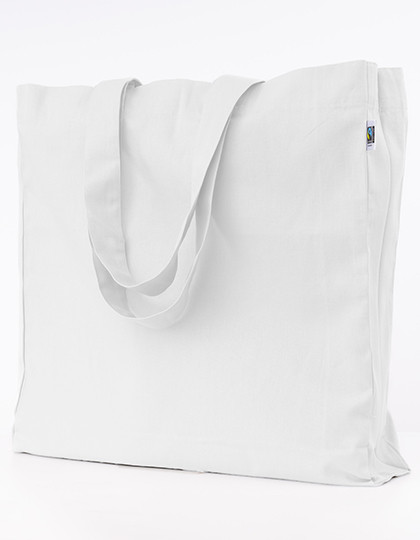 100% Fairtrade-zertifizierte Bio Baumwolle | Robuste Köperbindung | Breite, lange Trageriemen (L/B ca. 70/4,5 cm | Oversize Größe 50 x 50 cm | Breite Boden- und Seitenfalte | Schwere Grammatur von 280g/m² | Kreuznähte an Henkelverbindung | Stabile Innenverkettung | Fairtrade Siegel außen am Beutel sichtbar | Lieferung ohne Inhalt/Deko