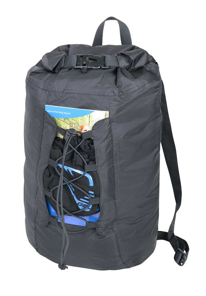 Trekkingrucksack faltbar (platzsparend im Innenfach verstaubar), ultraleichte 140g, 100% Ripstop Nylon mit TPU coating, wasserdicht, großes Hauptfach mit Rolltop Verschluss, Fassungsvermögen 18 Liter, Elastikbänder für zusätzliche Aufbewahrung von z.B. Jacke oder Helm, Handschlaufe, verstellbare Schultergurte, Notfallpfeife, Nylon, schwarz