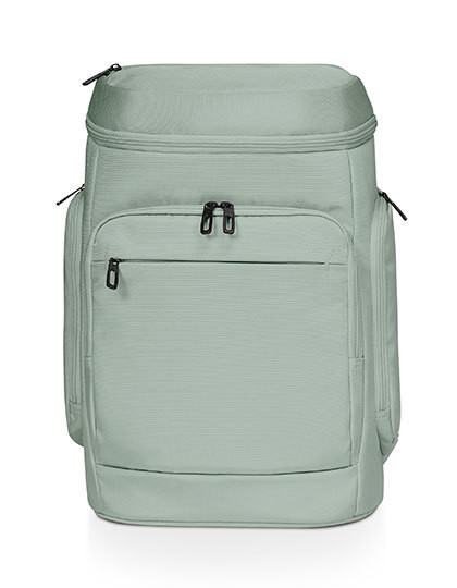 Recycelter Oberstoff | Voll gepolstertes Hauptfach mit dreiseitig umlaufendem 2-Wege-Reißverschluss für komfortables Packen | Helles Innenfutter für optimale Übersicht | Große, gepolsterte Vortasche mit 2-Wege-Reißverschluss und Isolierwirkung, ideal z. B. für Lunchbox | Zusätzlich flaches Reißverschluss-Vorfach | Flaches Reißverschluss-Deckelfach | zwei Reißverschluss-Seitentaschen | Innen: gepolstertes Notebookfach mit Befestigungslasche, verdecktes AirTag-Fach, Reißverschluss-Netzfach | Rückseitig ergonomisch gepolstertes Tragesystem mit höhenverstellbarem Brustgurt | Befestigungsschlaufe für Trolley-Gestänge | Handgriff