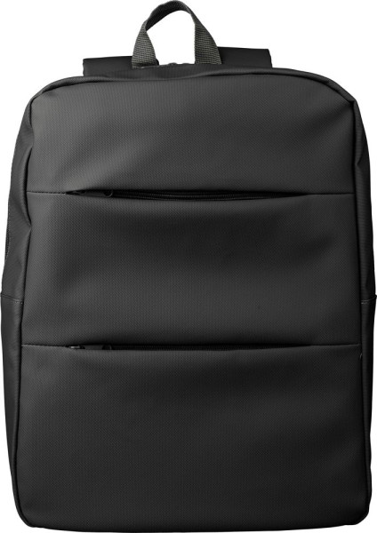 Laptop-Rucksack aus PU (15”) mit zwei Reißverschlusstaschen auf der Vorderseite, einer großen Reißverschlusstasche mit Klettverschluss für den Laptop und mehreren Innenfächern. Belüftete, gepolsterte Rückseite mit Trolleyriemen und verstellbaren Schultergurten. Wasserabweisend.
