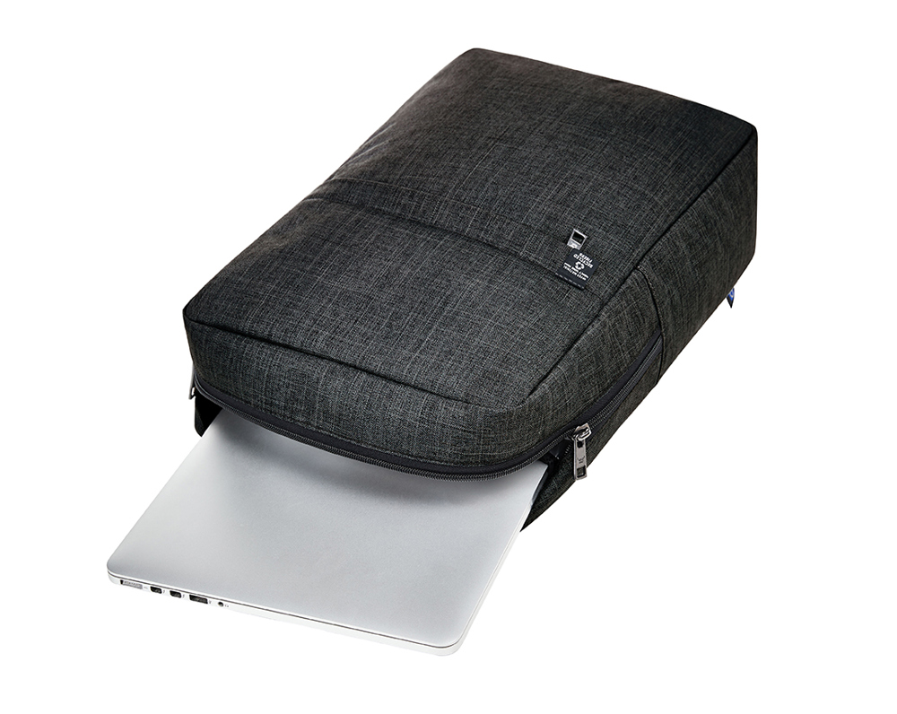 gradlinig gearbeiteter Rucksack; rPET Obermaterial; großes Hauptfach mit 2-Wege-Reißverschluss und gepolstertem Notebookfach; Reißverschluss-Vortasche; aufwändig gepolsterter Rücken mit verstecktem Reißverschlussfach; längenverstellbare gepolsterte Schultergurte mit Gummischlaufen zum Befestigen von z.B. Sonnenbrille; Handgriff