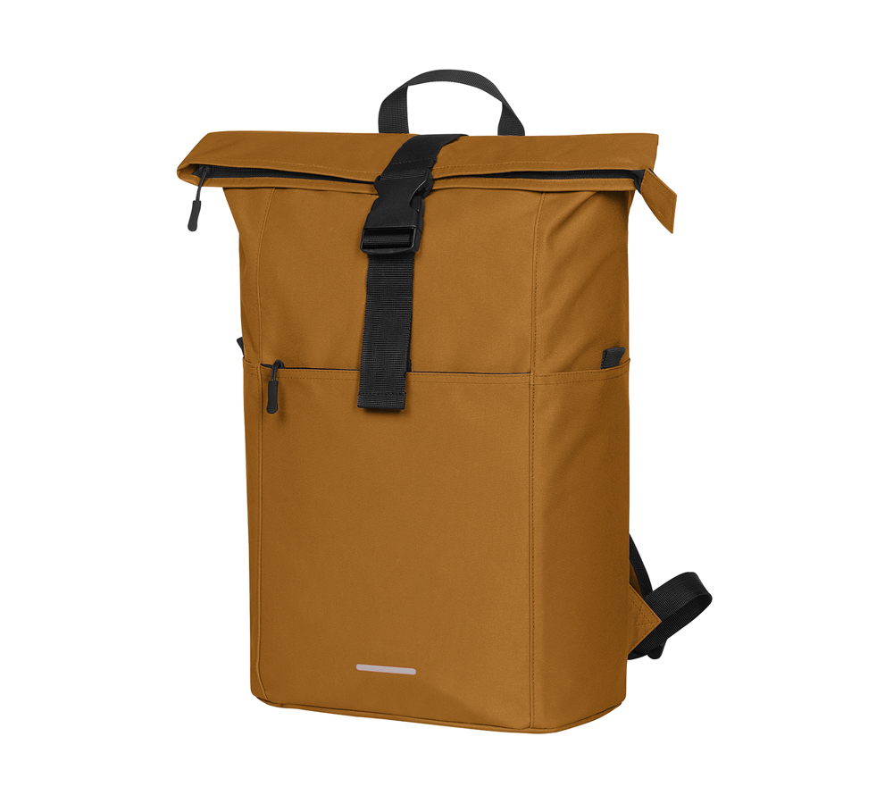 praktischer Roll-Top Rucksack; recycelter Oberstoff; großes Hauptfach mit Reißverschluss und zusätzlichem Steckverschluss; attraktiver Reflexdruck; RPT-Obermaterial; großes gepolstertes Einsteckfach; Airtag-Einsteckfach; große Reißverschluss-Vortasche auf der Front; zwei seitliche Einsteckfächer für z.B. Trinkflasche; gepolstertes Tragesystem; Handgriff