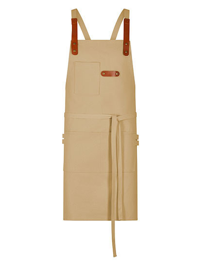 Mit Kreuzbindung im Rücken | Breite: 70 cm / Länge: 80 cm | Mit einer großen, unterteilten Tasche | Mit durchgängigen Stoffbändern, austauschbar, mit je zwei Druckknöpfen | Zier-Label aus PU-Leder auf Brusthöhe links, bedruckbar, abnehmbar