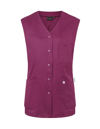 Köpergewebe, 150 g/m² | Waschecht, pflegeleicht, nachhaltig | Damenkasack ohne Ärmel und mit V-Ausschnitt | Polyesteranteil aus recyceltem Plastik | Besonders leichter Stoff für ein angenehmes Tragegefühl im Berufsalltag | Waschbarkeit bei 95°C | Leicht tailliert geschnitten | 2 aufgesetzte Seitentaschen mit verdeckter Innentasche rechts | 1 Schlaufe in der Seitentasche zur Anbringung einer Schlüsselkette | 1 aufgesetzte Brusttasche links mit Stiftfach | 5 zentrale Druckknöpfe zum Verschließen des Kasack | Grüner Knopf zertifiziert, www.g-k.eu/karlowsky