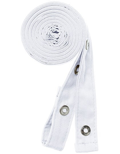 Zwei Bänder für Latzschürzen, je 230 cm lang und 2,5 cm breit | Mit Druckknopf zum Befestigen an der Schürzen-Öse | Im Rücken gekreuzte Bänder zur Entlastung des Nackens und stufenlosen Verstellung | Hochveredeltes Mischgewebe | Knitterarm | Strapazierfähig | Bis 95°C waschbar | Industriewäsche- und finishertauglich