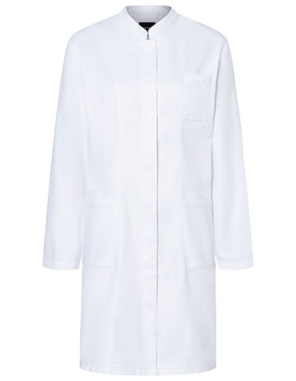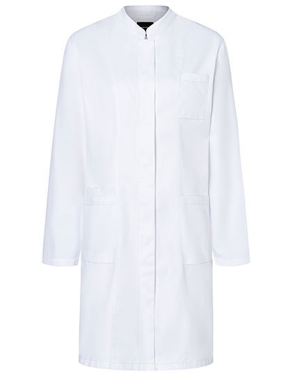 Köpergewebe | Hochveredelt, einlaufvorbehandelt, waschecht, pflegeleicht | Langer Arbeitskittel mit modernem Stehkragen | Leicht tailliert geschnitten | 2 aufgesetzte Seitentaschen mit verdeckter Innentasche rechts | 1 Schlaufe in der Seitentasche zur Anbringung einer Schlüsselkette | 1 aufgesetzte Brusttasche links (mind. 8 x 11,5 cm) | Versteckte Knopfleiste mit 5 Druckknöpfen | Seitenschlitze für besondere Bewegungsfreiheit | Lange Ärmel mit größenverstellbarer Einknopfmanschette | Industriewäschetauglich