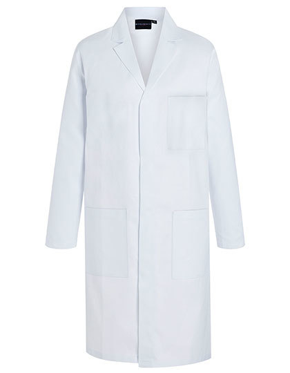 Köpergewebe | Hochveredelt, einlaufvorbehandelt, waschecht, pflegeleicht | Langer Arbeitskittel mit Reverkragen | Leicht tailliert geschnitten | 2 aufgesetzte Seitentaschen mit verdeckter Innentasche rechts | 1 Schlaufe in der Seitentasche zur Anbringung einer Schlüsselkette | 1 aufgesetzte Brusttasche links (mind. 10 x 11,5 cm) | Versteckte Knopfleiste mit 6 Druckknöpfen | Seitenschlitze für besondere Bewegungsfreiheit | Lange Ärmel mit größenverstellbarer Einknopfmanschette | Industriewäschetauglich