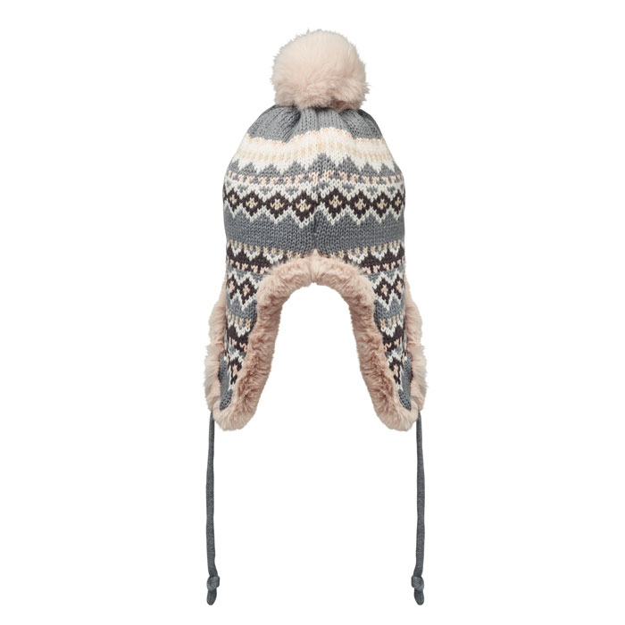 Gestrickte Mütze mit Ohrenklappen und Bommel aus Acrylfaser mit Polyester- und Fleece-Futter. Mit Label zur Werbeanbringung. Einheitsgröße.