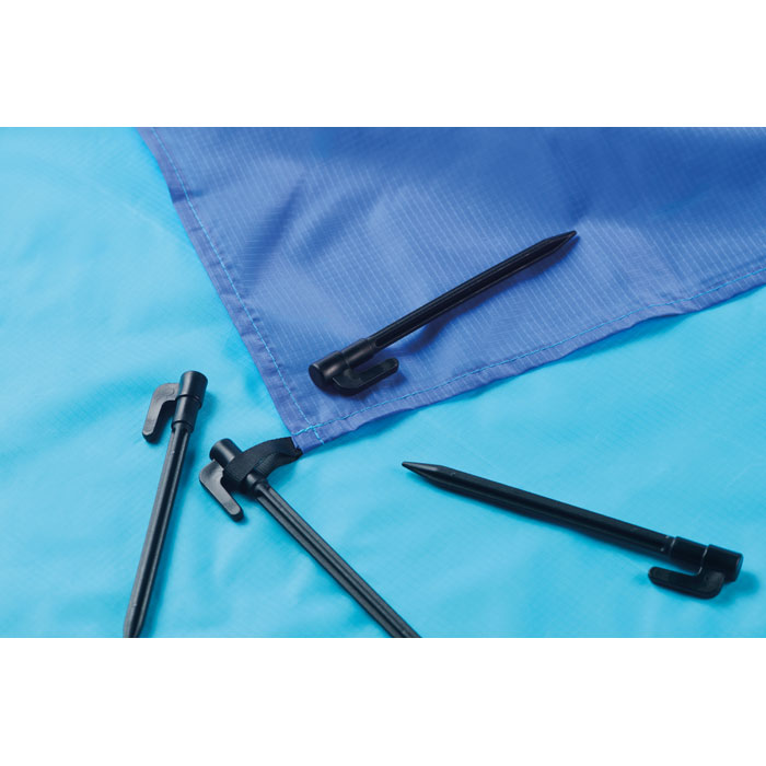 Leichte Strandmatte aus 210T Polyester. Inkl. 4 schwarzen Haken und passendem Beutel mit Kordelzug. Maße: 200x210cm.