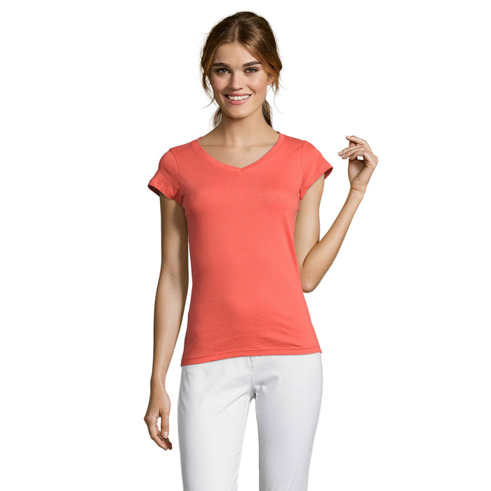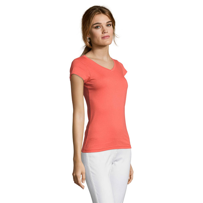 SOL'S MOON Damen-T-Shirt mit tiefem V-Ausschnitt und taillierter Schnittführung. Rippkragen, Nackenband, Kurzarm, Seitennähte. Material: 150g/m² 100% halbgekämmte, ringgesponnene Baumwolle.