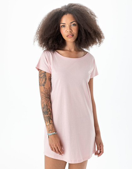 Zertifizierung als Bio-Baumwolle in Arbeit | Single Jersey | Weiter Halsausschnitt | Abgerundeter Saum | Oberhalb Knielänge | Kurze, nahtlose Flügel-Ärmel | Abreißetikett