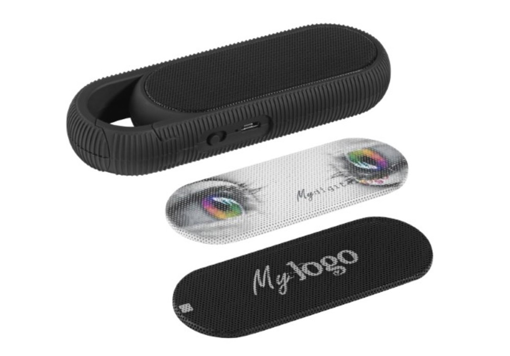 Kompakter Wireless Lautsprecher mit großem Sound und Karabiner - ideal für unterwegs! Top Preis und Werbemöglichkeit durch vollflächigen Digitaldruck auf dem Soundgitter.