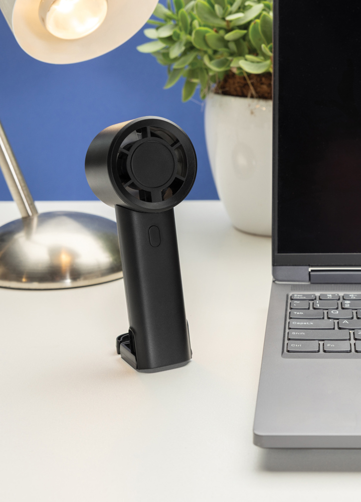 Der tragbare Ventilator Twist aus RCS-zertifiziertem recyceltem Kunststoff ist eine kompakte und vielseitige Lösung, um überall für angenehme Kühle zu sorgen. Mit wiederaufladbarem 1200mAh-Li-Ionen-Akku, der in nur 3h Ladezeit über das mitgelieferte 30cm lange schwarze TPE-Kabel (USB-A auf USB-C) bis zu 6h Betriebszeit bietet. Mit drei einstellbaren Geschwindigkeitsstufen & einem ausziehbaren Haken, der gleichzeitig als Ständer dient, eignet sich der Twist-Ventilator perfekt für den Einsatz am Schreibtisch, am Bett oder auf Reisen. Das Gehäuse besteht aus RCS-zertifiziert recyceltem ABS-Kunststoff. RCS (Recycled Claim Standard) ist ein Standard zur Überprüfung des Recyclinganteils eines Produkts entlang der gesamten Lieferkette. Gesamtanteil an recyceltem Material: 35% bezogen auf das Gesamtgewicht des Artikels. Dieser Ventilator ist PVC-frei und in einer FSC®-zertifizierten Kraftbox verpackt. Max. Leistung: 2W | Eingangsstrom: 5V / 1A