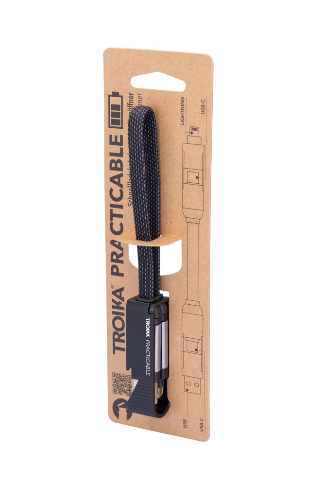 Schnellladekabel mit Flaschenöffner für unterwegs, USB/USB-C auf Lightning oder USB-C, mit Datenübertragungsfunktion, Kabel textilummantelt, Metall, matt, schwarz