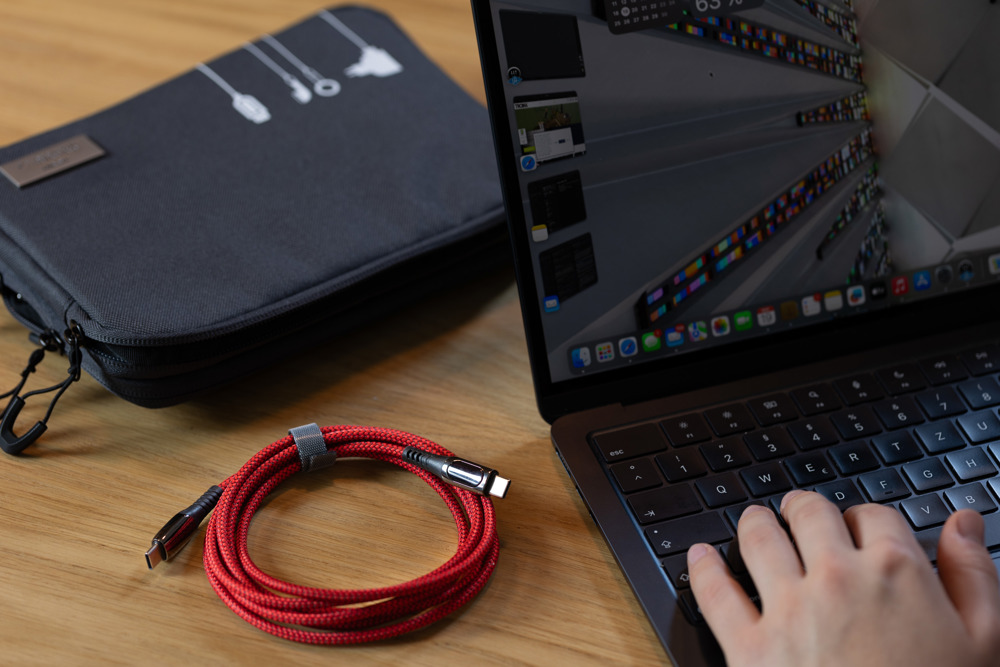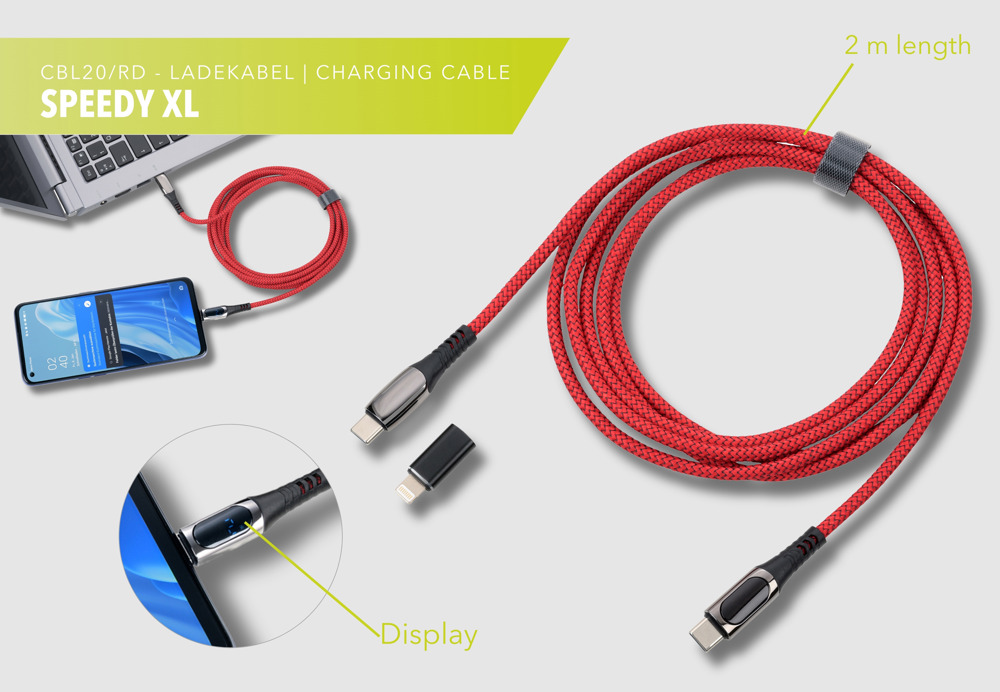 Ladekabel High-Speed USB-C 100W PD Power Delivery auf USB-C, mit Datenübertragungsfunktion, volle Ladekapazität: max. 100W|20V|5A (ohne Adapter), abhängig vom zu beladenen Gerät, mit digitaler Anzeige der Ladeleistung, inkl. USB-C auf Lightning Adapter, Kabel textilummantelt (Netzstruktur), recyceltes Polyester, 2m Länge, Metall, Polyester, gunmetal/rot
