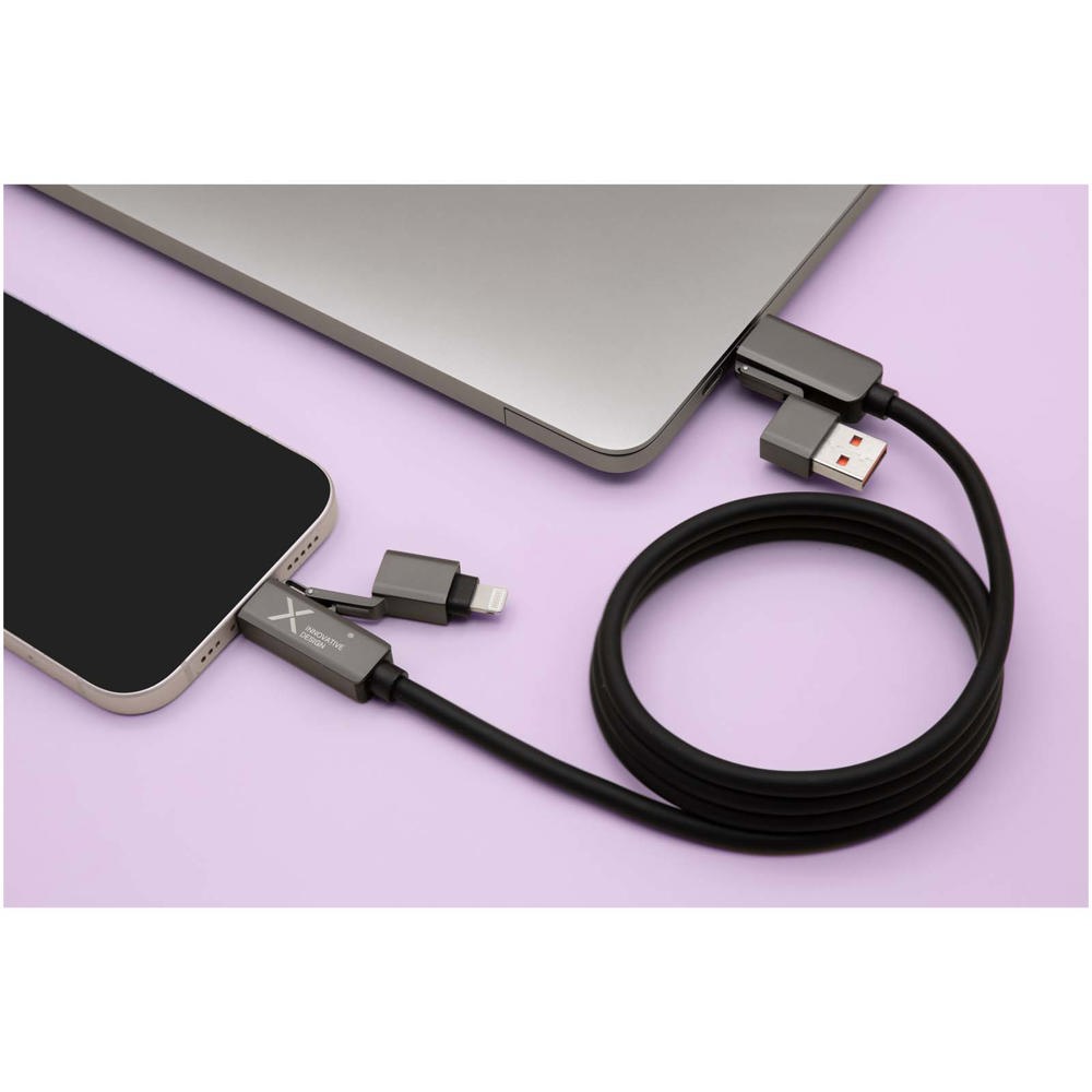 Ultraschnelles 100W Magnetladekabel zum Aufladen von Smartphones, Tablets und Laptops. Das 1 Meter lange Flachkabel ist mit Type-C- und Lightning-Anschlüssen ausgestattet. Es besteht aus recyceltem Silikon und besitzt robuste Endkappen aus einer Zink Legierung. Dank doppeltem USB-A und USB-C Eingang ist es zu 100% mit den neuesten Computermodellen kompatibel. Vollständig kompatibel mit Apple CarPlay und Android Auto. Die Endkappe aus Zink kann per Lasergravur individuell gestaltet werden. Lieferung in einer recycelbaren TPU-Hülle mit einem Einleger aus Recyclingpapier.