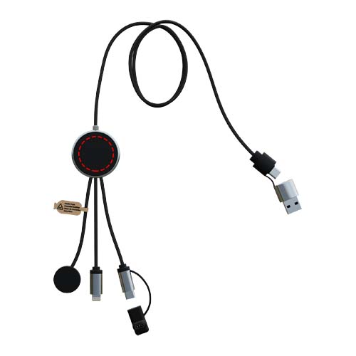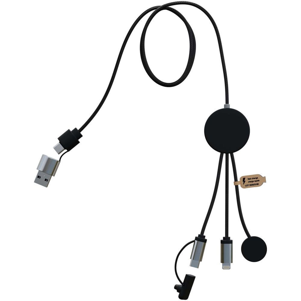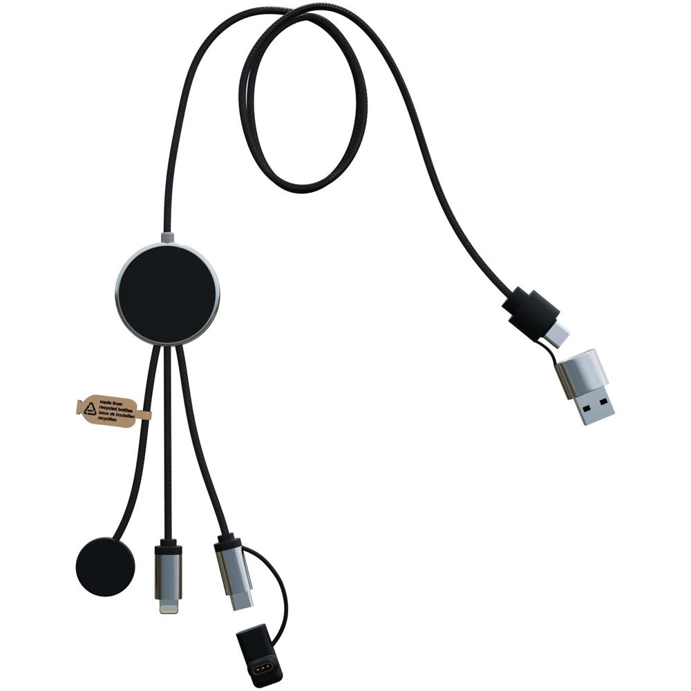 Dieses 7-in-1 Ladekabel wurde speziell für Smartwatches entwickelt und verfügt über fünf Ausgangsanschlüsse: Lightning, Typ C, Apple Watch, Samsung Watch und Garmin. Es bietet zwei Eingangsoptionen (USB-A und USB-C) und ist somit mit den neuesten USB-C Geräten und Computern kompatibel. Die Kabel sind aus recycelten Kunststoffflaschen hergestellt, und das Kabel kann zwei oder drei Geräte gleichzeitig aufladen. Lieferung mit individueller Frontgestaltung und Verpackung in einer recycelbaren TPU-Hülle mit einer Rückseite aus Recyclingpapier.