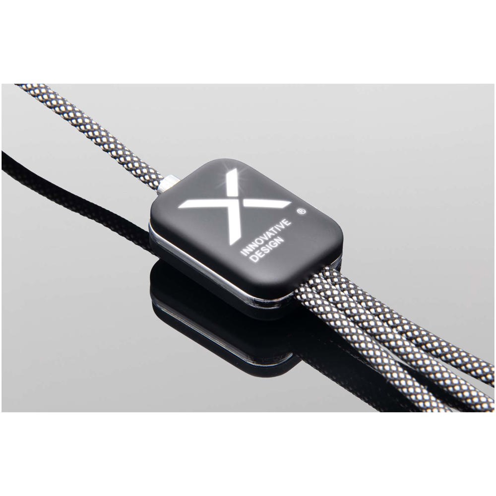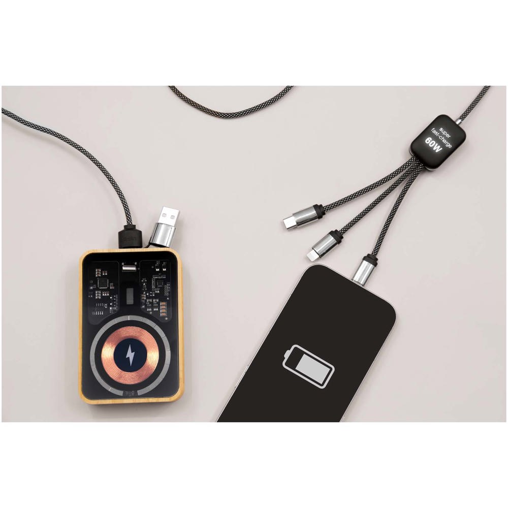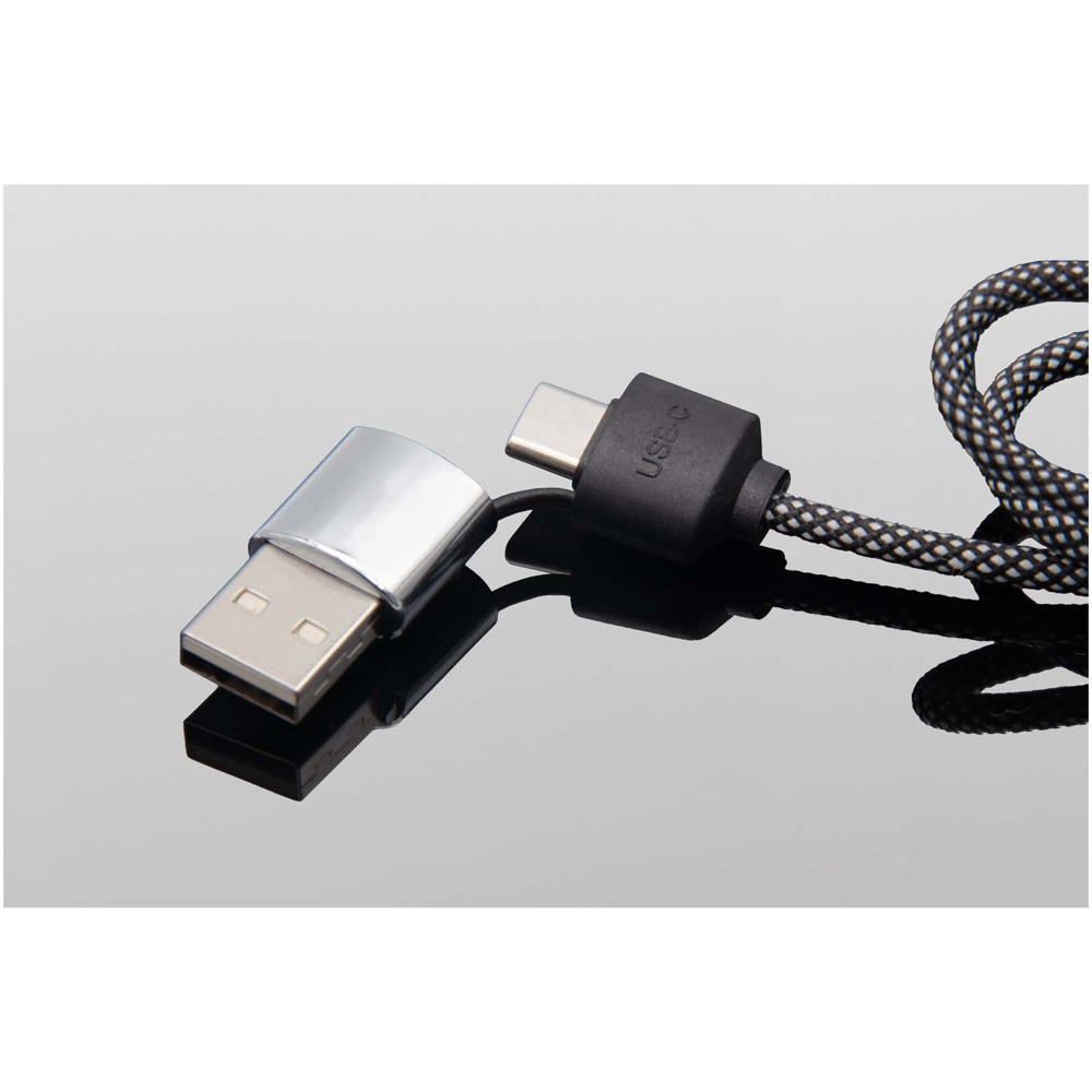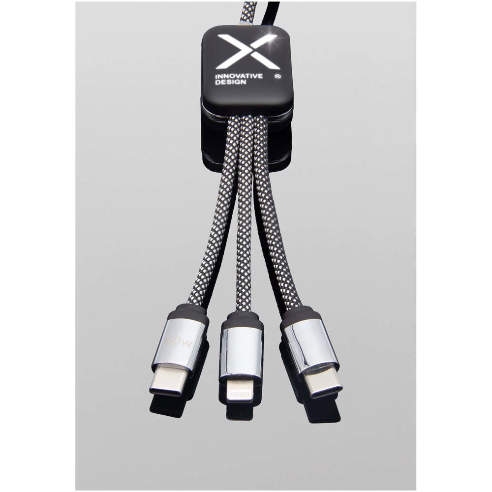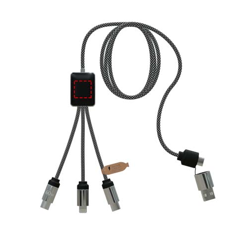 Dieses 1 Meter lange 60W Ladekabel verfügt über eine elegante Verkleidung aus Gummi und Metall, ein Kabel aus recycelten Kunststoffflaschen sowie zwei beleuchtete Logos, die individuell angepasst und optional unterschiedlich gestaltet werden können. Dank der drei Anschlüsse (2 × Typ C und 1 × Lightning) können zwei oder drei Geräte gleichzeitig aufgeladen werden. Der doppelte USB-A- und USB-C-Eingang macht es vollständig kompatibel mit den neuesten Computern, einschließlich USB-C Modellen. Das Kabel ist beidseitig anpassbar und wird in einer recycelbaren TPU-Hülle mit einer Rückseite aus Recyclingpapier geliefert.