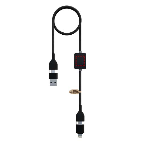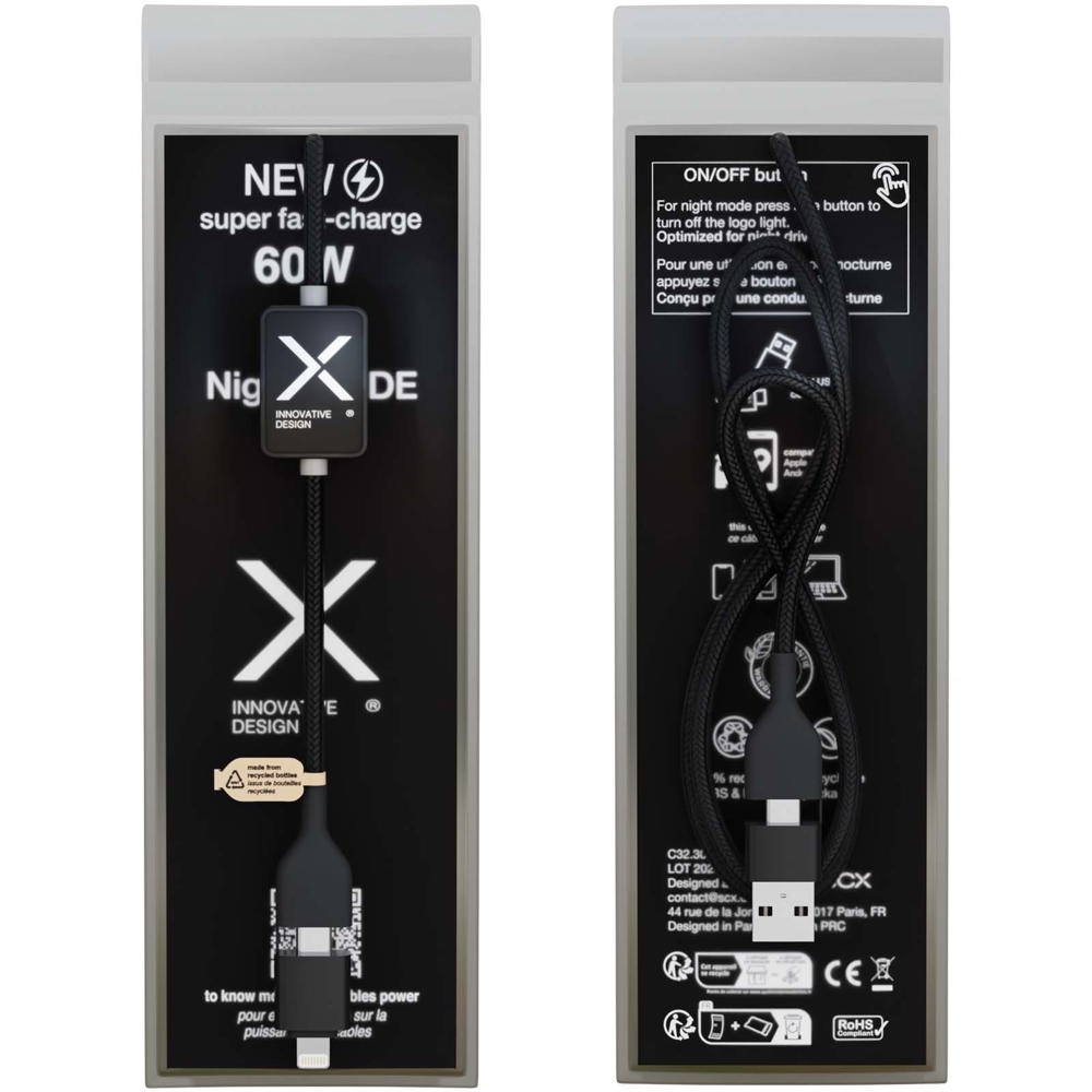 Dieses 1 Meter lange Schnellladekabel mit 60W Leistung verfügt über ein Leuchtlogo sowie einen Schalter, mit dem sich das Licht nachts ausschalten lässt. Es eignet sich somit ideal für das Schlafzimmer oder das Auto. Zur Datenübertragung mit Apple CarPlay und Android Auto geeignet. Es bietet Type-C- und Lightning-Anschlüsse sowie doppelte USB-A- und USB-C-Eingänge für universelle Kompatibilität, auch mit den neuesten MacBook-Modellen. Das Kabel besteht aus recyceltem ABS/PET Kunststoff und Aluminium. An einem Ende ist Soft-Touch-Gummi verarbeitet, am anderen satinierter recycelter Kunststoff. Verpackt in einer recycelbaren TPU-Hülle mit Rückseite aus Karton.
