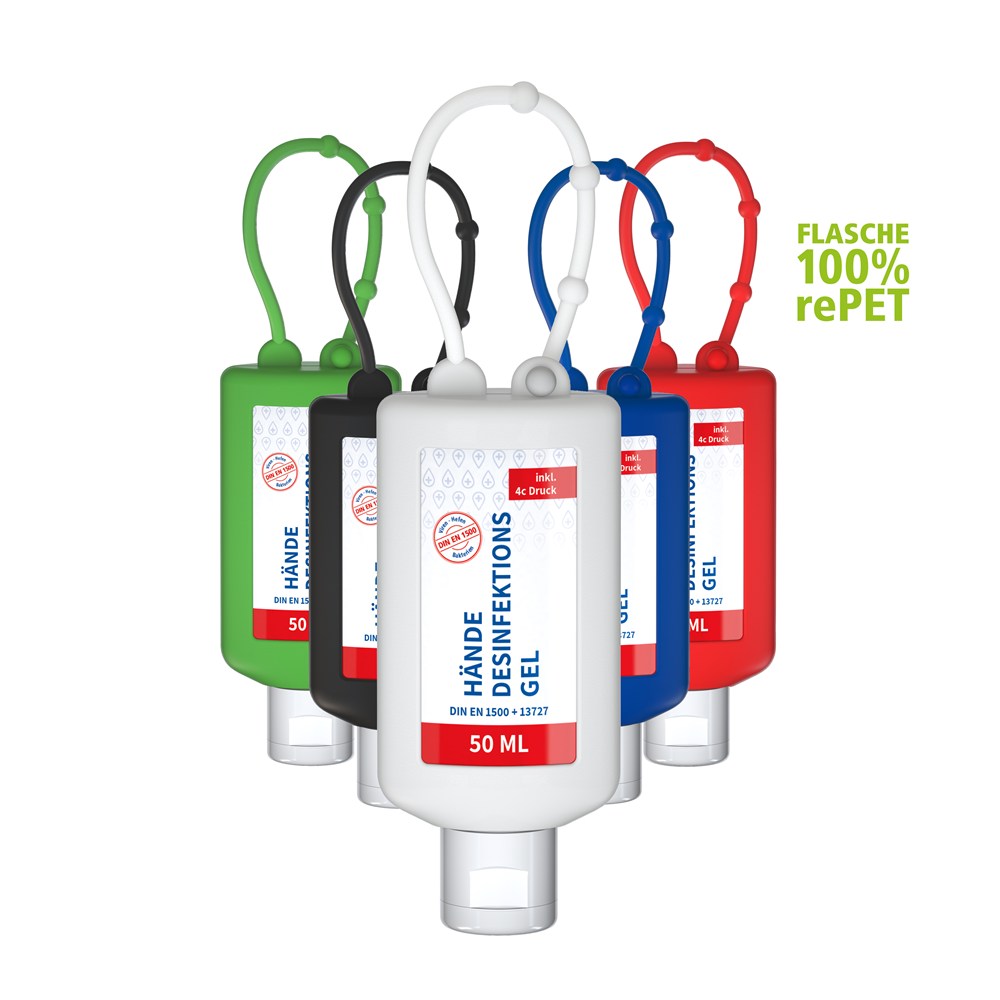 Hände-Desinfektionsgel (DIN EN 1500), 50 ml Bumper rot, Body Label (R-PET)