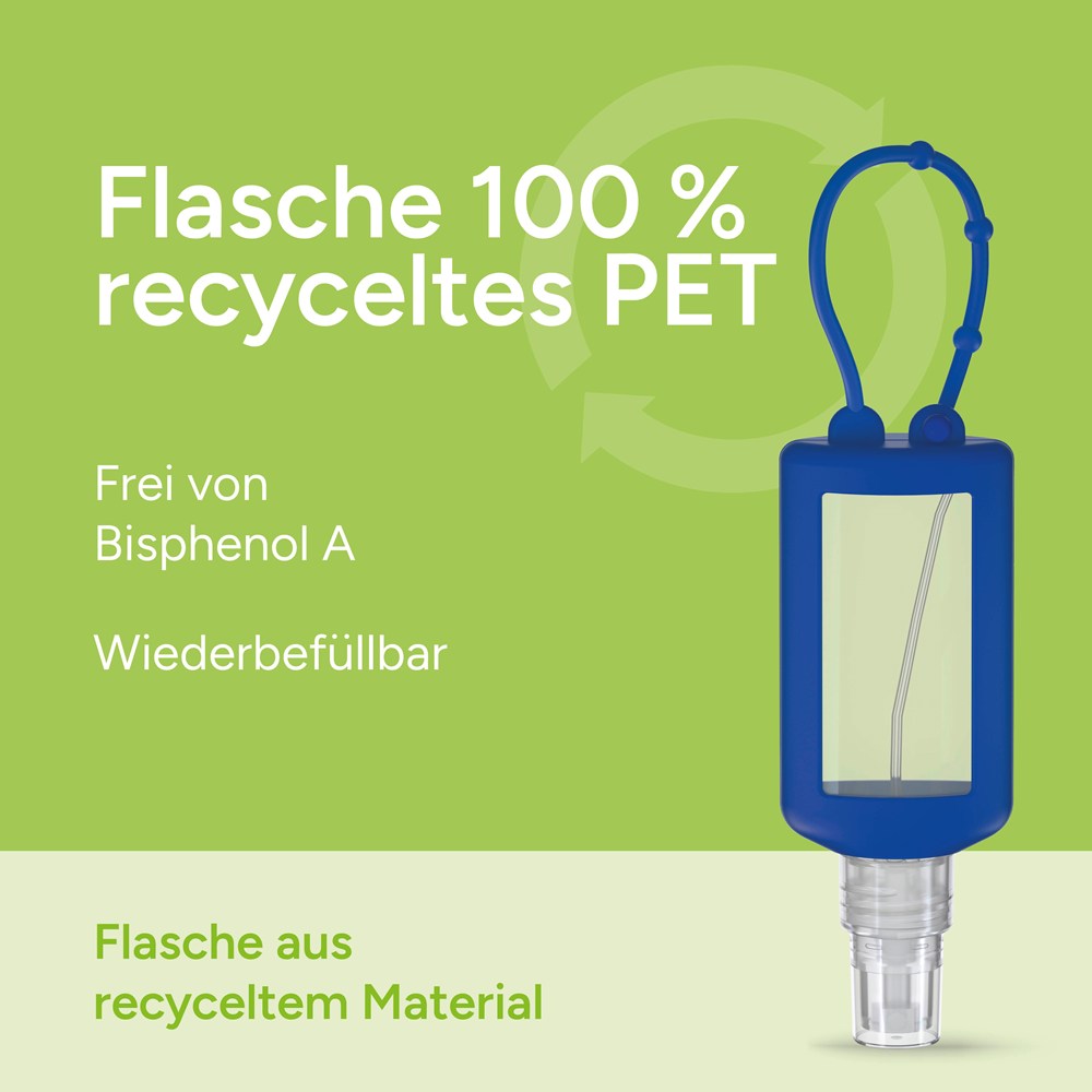 50 ml Flasche aus 100% recyceltem PET, transparent mit leichter R-PET-Färbung. Mit Pumpaufsatz "transparent" mit Schutzkappe; Silikonhülle und Schlaufe in blau. Nachfüllbar.