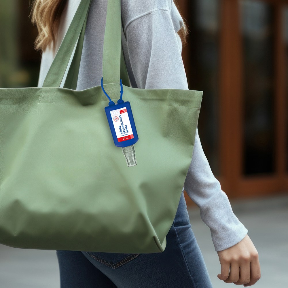 Hände-Desinfektionsspray (DIN EN 1500), 50 ml Bumper blau, Body Label (R-PET)